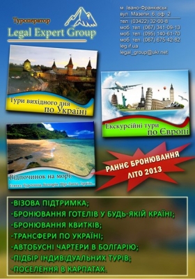 Останнє оновлення: 24 травня 2013Туристичний оператор «Legal Expret Group» створено енергійною командою у 2011р, яка має своїм життєвим кредо:"Якість та надійність послуг та європейський рівень обслуговування" .