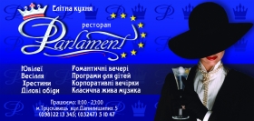 Ресторан "Parlament" приймає замовлення на святкування урочистих подій : дні народження, ювілеї, весілля, хрестини, ділові обіди, корпоративи, романтичні вечері. Вишуканий інтер"єр, затишна атмосфера, неперевершена європейска кухня, відмінний сервіс, колекція вина на смак найвибагливішого гурмана, жива інструментальна музика...