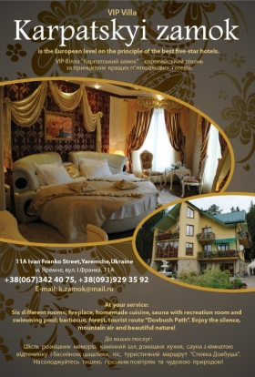 VIP Вілла «Карпатський замок» - складається із семи номерів з індивідуальним дизайном, просторої їдальні, сауни з басейном та кімнатою відпочинку. На обгородженій території знаходиться: альтанка, гойдалка, фонтан, шатро, літній басейн, кам'яний мангал, будиночок для барбекю з літнім майданчиком, стоянка для автомобілів. Безпосередньо за парканом вілли починається територія заповідника «Тропа Довбуша».