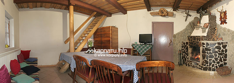 На першому поверсі — хол з каміном (обідній стіл зі стільцями, телевізор, DVD), кухня (газова плитка, мікрохвильова піч, холодильник, електрочайник, посуд), 2 кімнати (двоспальне ліжко, шафа для одягу, необхідний посуд, додаткове місце — розкладний диван), санвузол на 2 кімнати (душ, туалет, умивальник).