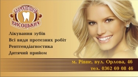 Стоматологічні послуги у місті Рівному: реставрації зубів,рентген-діагностика,протезування та відбілювання зубів.Також ведеться дитячий прийом. Сучасні методи профілактики карієсу,гігієна порожнини рота.Навчання дітей і батьків як вірно доглядати за своїми зубками.Привітний персонал,регулярні акції і системи знижок для постійних клієнтів.Завітайте до нас і ми подаруємо Вам нову ПОСМІШКУ!!! ТЕЛЕФОНУЙТЕ вже зараз за тел.69-08-46 завжди Вам раді!