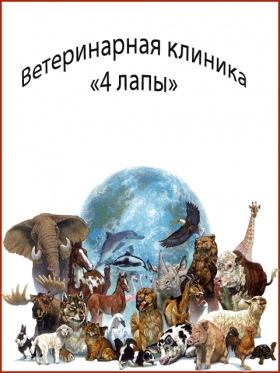 Нашей целью является забота о Ваших питомцах, оказание им квалифицированной помощи по доступным ценам. Мы оказываем ветеринарную помощь не только собакам и кошкам, но и грызунам, кроликам и даже птицам. В ветеринарном кабинете «4 лапы» работают высококвалифицированные специалисты с большим опытом работы, любящие животных и всегда готовые прийти Вам на помощь. Мы рады предложить все виды ветеринарной помощи: консультацию, диагностику, лечение и профилактику. Так же с удовольствием ответим на все интересующие Вас вопросы по содержанию животных, вакцинации, стерилизации, подберем оптимальную диету для Вашего питомца, ознакомим с комплексом профилактических мероприятий для поддержания здоровья Вашего любимца.