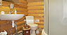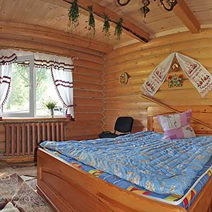 На першому поверсі — кухня (кухонне вогнище, електрична плита, холодильник, посуд, мийка, обідній стіл), 2 двомісні номери (двоспальне або 2 односпальні ліжка, шафа для одягу, телевізор), санвузол (душова кабіна, туалет, умивальник).