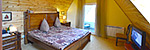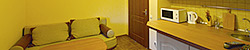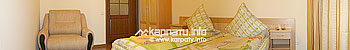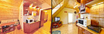 На першому поверсі — 3 півлюкси (двоспальне або 2 односпальні ліжка, шафа для одягу, телевізор, холодильник, електрочайник, посуд, мийка, санвузол — душова кабіна, туалет, умивальник, фен). У двох номерах є додаткове місце — розкладне крісло. На другому поверсі є люкс "Краєвид" — вітальня (2 розкладні дивани, телевізор, кухонний куток — мікрохвильова піч, холодильник, електрочайник, посуд, мийка, обідній стіл), спальня (двоспальне ліжко, шафа для одягу, телевізор), санвузол (душова кабіна, туалет, умивальник, фен). Опалення: автономне водяне.