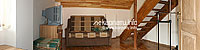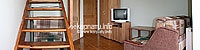 На першому поверсі — вітальня (камін, м'який куточок, телевізор, караоке, столи зі стільцями, вихід на терасу), кухня (холодильник, газова плита, потрібний посуд, посудомийна машина), двомісний номер (двоспальне ліжко, телевізор, шафа для одягу, додаткове місце — розкладне крісло), санвузол (туалет, умивальник, душова кабіна).