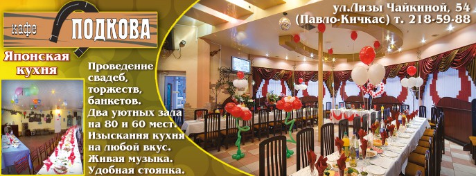 Кафе «Подкова» предоставляет Вам возможность проведения праздничных вечеров, торжественных мероприятий. Два уютных зала на 80 и 50 посадочных мест, живая музыка, превосходная кухня, огромный выбор напитков и коктейлей, автостоянка, внимание к клиентам. Летом работает летняя площадка с фонтаном, располагающая посетителей к легкому и непринужденному отдыху — все это Вы сможете оценить, посетив наше кафе.