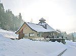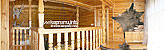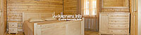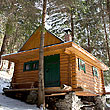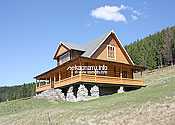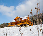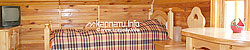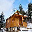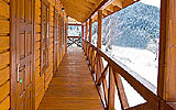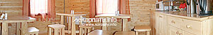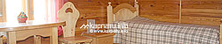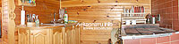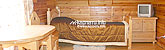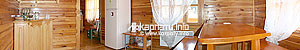 Котедж має простору криту терасу (великий дерев'яний стіл і 2 дерев'яні лавки). Поруч є мангал. На першому поверсі — вітальня в мисливському стилі з каміном і терасою (розкладний диван, телевізор, стіл зі стільцями на 12 осіб), їдальня (стіл, стільці, холодильник), кухня (кухонне вогнище, газова плита, мікрохвильова піч, кавоварка, електрочайник, посуд), кімната з низькою температурою для зберігання продуктів, санвузол (умивальник, душова кабіна, туалет, фен). На другому поверсі — хол, 2 спальні (в кожній — 2 односпальні ліжка, телевізор, шафа для одягу, комод, стіл, 2 стільці, можливе додаткове дитяче ліжко для дітей до 4 років).
