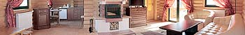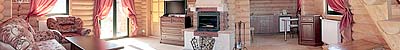 Номер на першому поверсі — спальня (двоспальне ліжко), вітальня (камін, розкладний диван, телевізор, музичний центр), санвузол (туалет, умивальник, душ).