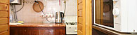На першому поверсі — кухня (газова плита, холодильник, мийка, необхідний посуд, обідній стіл).