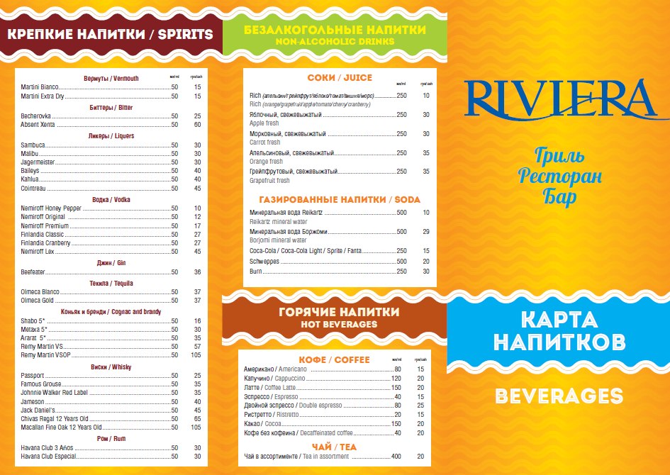 Гриль-бар «RIVIERA» предложит гостям блюда, приготовленные на гриле: разные сорта качественного мяса, рыбы и колбасок. Наши салаты удивят Вас своими необычными сочетаниями вкусов, а заботливый персонал всегда поможет с выбором! Так же в меню представлено огромное разнообразие вин, в том числе, здесь можно попробовать наше фирменное вино Reikartz Каберне и Шардоне, а также живое пиво Reikartz с пивоваренного завода компании в Николаеве.