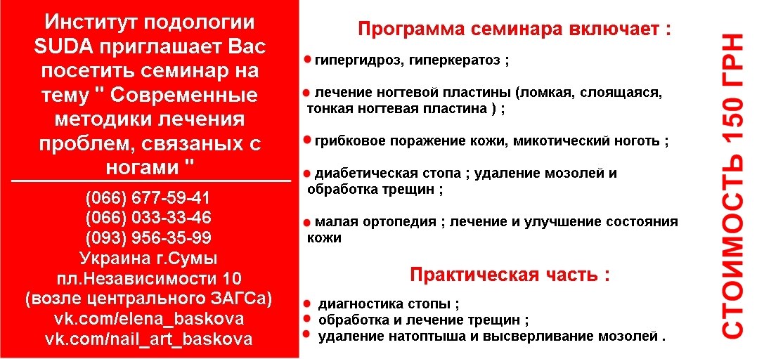 Официальный преставитель немецкой подологической школы Suda в г.Сумы является студия дизайна ногтей Елены Басковой.Лечебная косметика для ног из Германии.Лечение вросших ногтей,трещин,грибковых инфекций,бородавок,постан