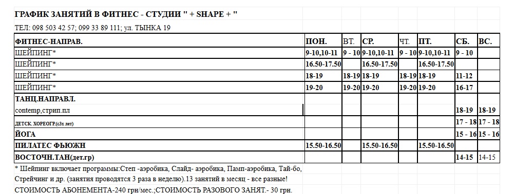 Фитнес-студия"SHAPE",г.Кривой Рог,ул.Тынка19