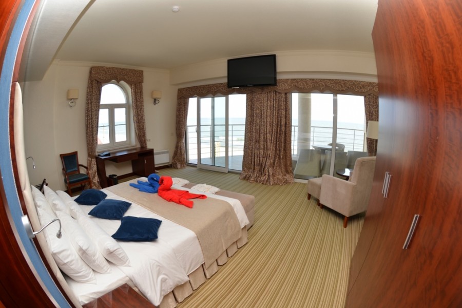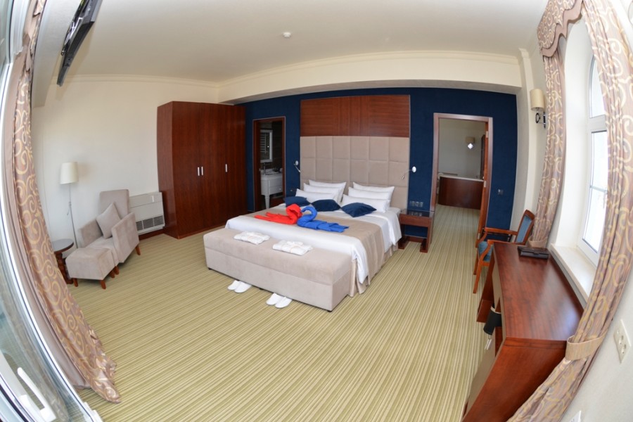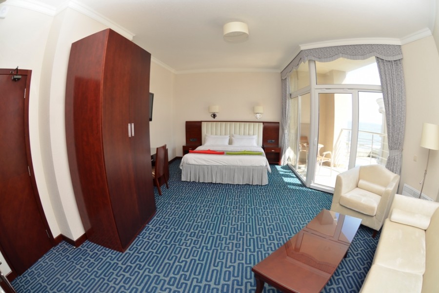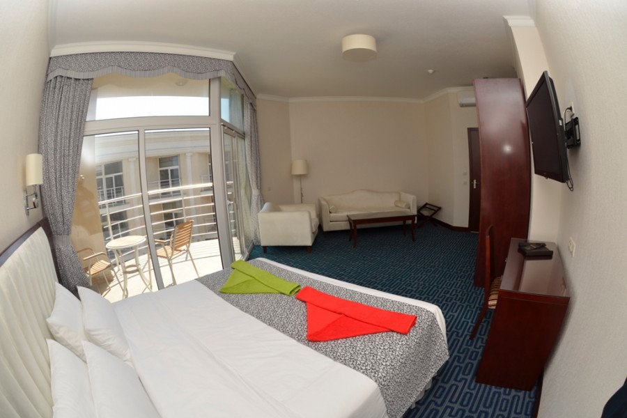 Номер - Полулюкс / Junior Suite 2х комнатный номер. Гостинная с высококачественной мебелью из натуральных материалов, где вы можете с комфортом принять гостей или устроить романтичекий ужин при свечах. Двухспальная кровать king size. Полностью оборудованная просторная ванная комната, летняя терраса-балкон.