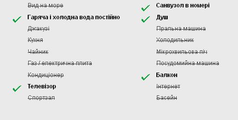 До послуг постояльців : двоспальне ліжко, крісло-ліжко, балкон, металопластикові вікна, килим, приліжкові килимки і тумбочки, сателитарное ТБ, окремий сан-вузол (душова кабіна, полотенцесушитель, постійна гарячая і холодна вода), журнальний столик, 2 пуфи, шафа-купе, вішалка.