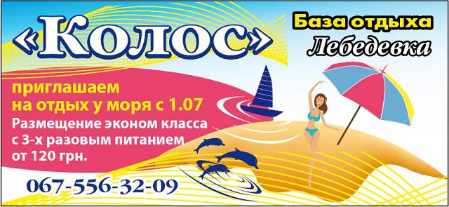 Отдых на Черном море в Лебедевке предлагает база отдыха "Колос". Особенность базы отдыха "Колос" - выход территории на самый обрыв над морем. Отсюда удобно, сидя на лавочках и в беседках, наблюдать за восходящим солнцем или за купающимися в прозрачной воде Черного моря дельфинами.