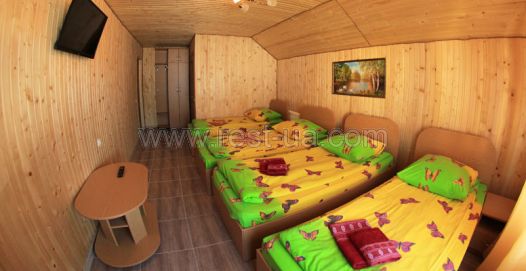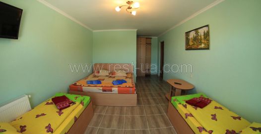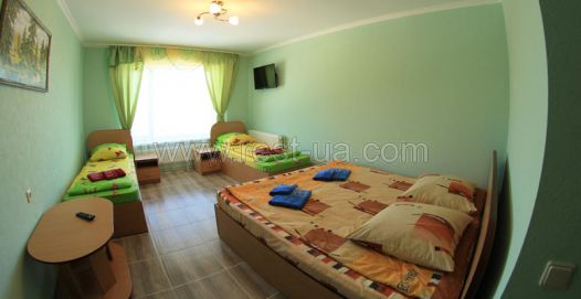 Стандарт 4 - місний №03, №04, №09, №010, №015, №016 (однокімнатний, 4 - місний номер, загальна площа - 20 м. кв.) Двоспальне ліжко + 2 односпальні ліжка (№03, №09, №015) або 4 односпальні ліжка (№04, №010, №016), супутникове ТБ, санвузол (душова кабіна, унітаз, умивальник, фен, кількість рушників – 2 на особу). Балкон в №015.