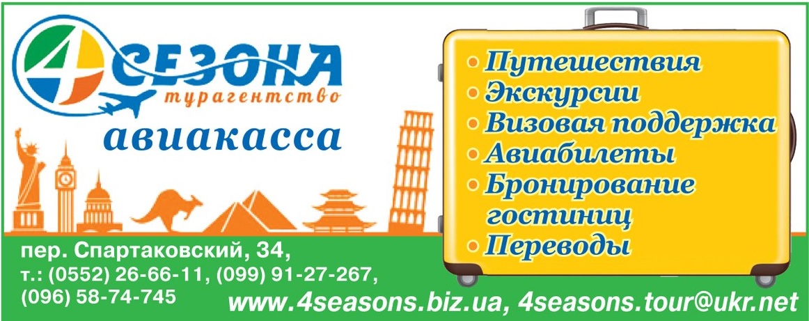 О нас: Четыре сезона - молодое, но опытное туристическое агентство. Влюблены в свою работу, любим путешествовать комфортно и качественно сами, поэтому наше правило: помогать людям отдыхать и путешествовать так же. С радостью организовываем незабываемые поездки и головокружительные приключения, познавательные экскурсии и романтический отдых для наших клиентов. В нашем распоряжении самые надежные лицензированные туроператоры, которые работают по всему миру больше 15 лет. Оказываем широкий спектр услуг: бронирование гостиниц, визовая поддержка, бронирование и покупка авиабилетов, все виды страхования, перевод документов.