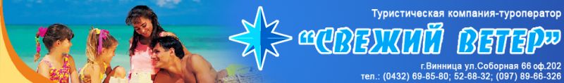Наше предприятие — туристическая компания «Свежий ветер» в течение шести лет работает в сфере внутреннего туризма, приема и размещения отдыхающих. За это время мы приобрели громадный опыт работы в организации коллективного и индивидуального отдыха и лечения. Сегодня мы предлагаем Вам наиболее популярные здравницы Крыма, которые обладают высоким уровнем сервиса и доброжелательным отношением к клиентам. Прекрасные климатические условия Крыма как будто созданы для оздоровления человека. Не зря в Крыму широко используется «климатотерапия» — т.е. просто находясь на нашем полуострове Вы УЖЕ принимаете лечебные процедуры!