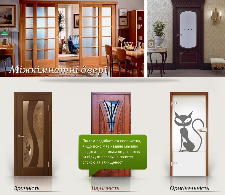 Міжкімнатні двері сьогодні це не розкіш, це предмет інтер'єру, що додає кімнаті певний стиль, здатний відтворити бажану атмосферу. Міжкімнатні двері з масиву, тобто натуральної деревини, вважаються за найпрестижніші, елітні. Такі двері екологічно чисті, тому і найдорожчі.