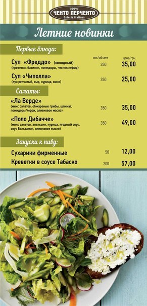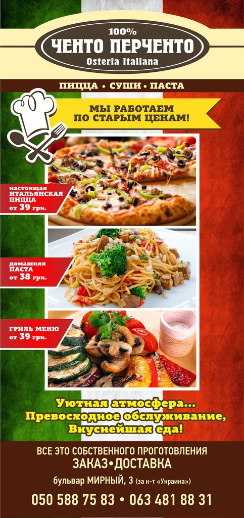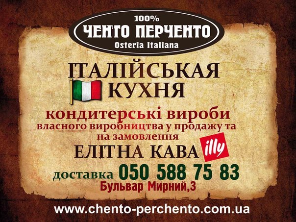 Что такое для простого обывателя итальянская кухня? Естественно, пицца, конечно, паста и, несомненно, много сыра, помидоров и базилика! Именно поэтому на Бульваре мирном 3, расположилась первая в Херсоне остерия Ченто Перченто.