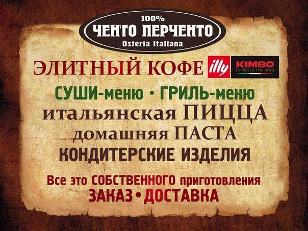 Не смотря на то, что Ченто Перченто это остерия, с итальянскими блюдами, для любимых клиентов, по многочисленным просьбам, мы ввели самые вкусные суши по приемлемым ценам! Приходите, пробуйте!