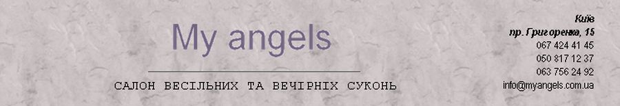 В салоні My Angels - затишна атмосфера, де Ви зможете спокійно приміряти будь-яке плаття, що сподобалось і відчути себе справжньою королевою. Бездоганна якість суконь приємно Вас вразить! Наші менеджери допоможуть вибрати потрібний фасон та всі необхідні аксесуари - фату, рукавички, сумочку, взуття, прикраси.