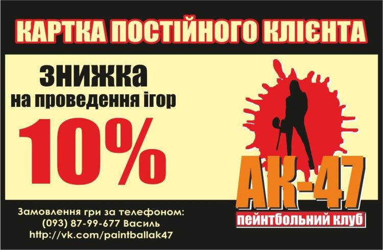 Після замовлення гри в нашому клубі (від 10 гравців) Вам надається дисконтна картка зі знижкою у 10% на наступні ігри.