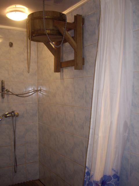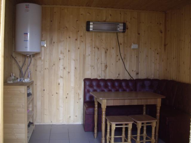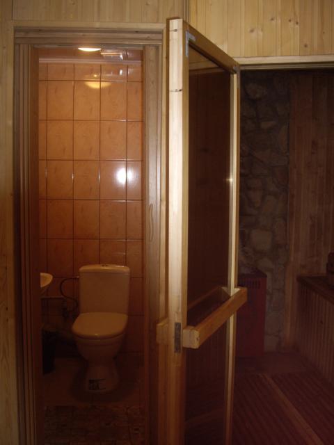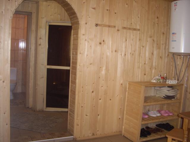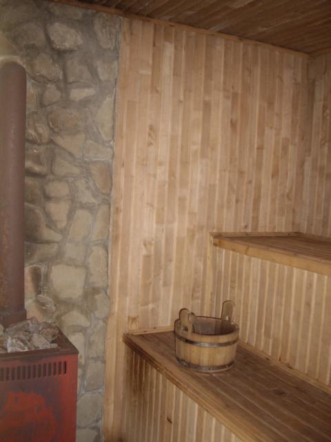 Сауна на дровах на 4-6 осіб — 100 грн за годину. Є кімната для відпочинку, діжка для обливання. У вартість входять — шапочки, простирадла, чай.